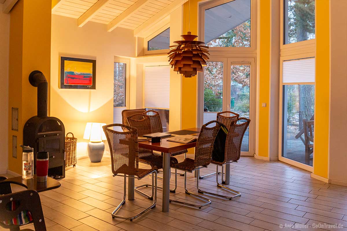 Der großzügig geschnittene Ess- und Wohnbereich lädt mit einem Kaminofen zum Verweilen ein und zur Entspannung und Stärkung trägt die hauseigene Sauna bei. Mehr Informationen auf www.haus-mellensee.de