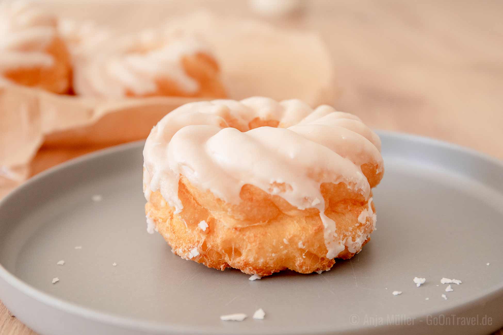- Den Puderzucker mit dem Wasser zu einer zähflüssigen Glasur verrühren und die Spritzkuchen damit bestreichen. Anschließend trocknen lassen.