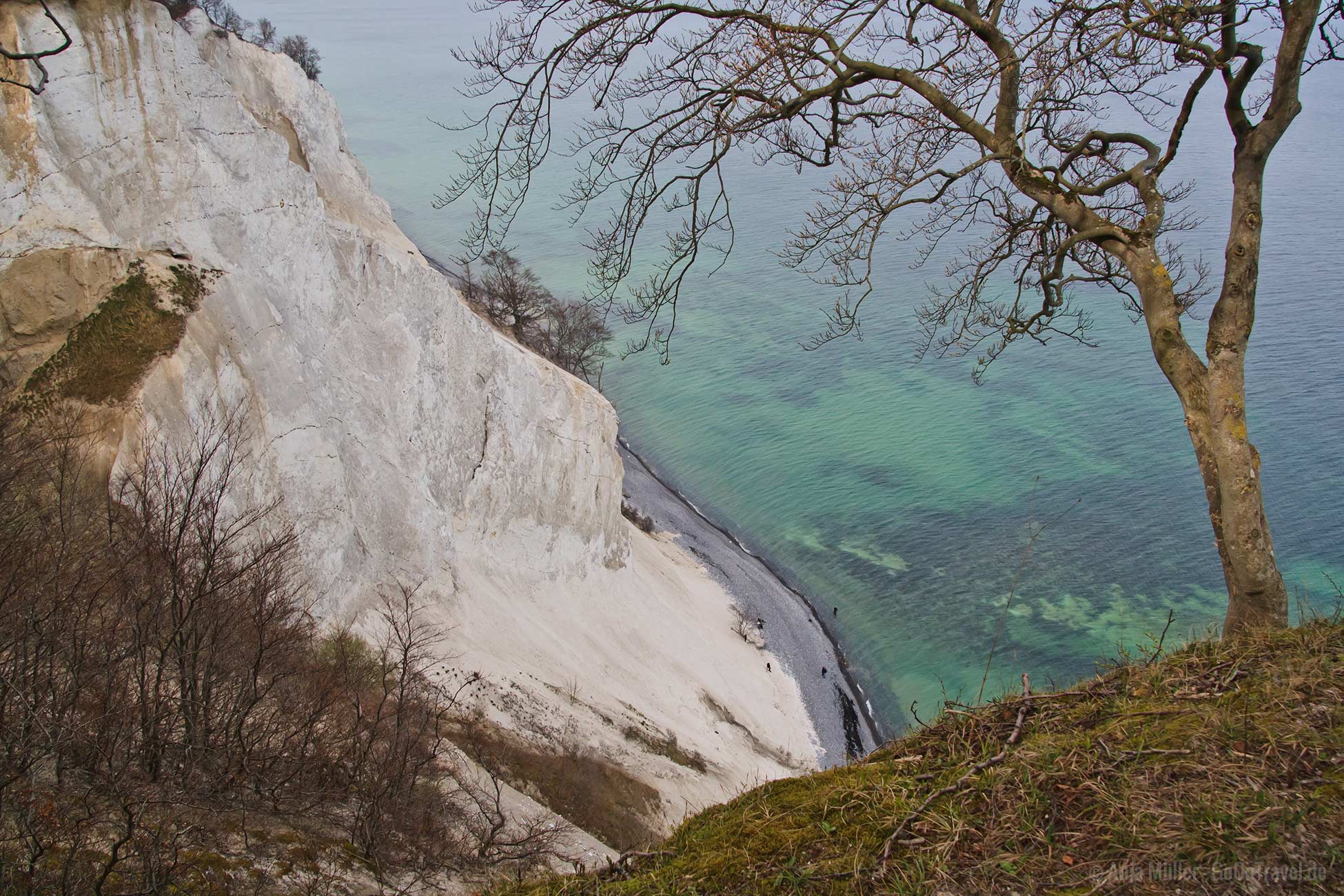 Der höchsten Punkt der Kreidefelsen ist mit seinen 128 Metern der Møns Klint. Man kann diesen sowohl von oben als auch von unten besichtigen. Von beiden Blickwinkeln hat man eine spektakuläre Sicht auf die weiße Steilwand. Ich möchte den Kreidefelsen von beiden Standpunkten sehen. Den einfacheren Weg hierfür gibt es von oben. Nach nur wenigen 100 Metern erreiche ich eine kleine Aussichtsplattform und erhalte hierfür als Belohnung einen herrlichen Blick auf den Kreidefelsen und das durch Kreideablagerungen türkis grüne Wasser.