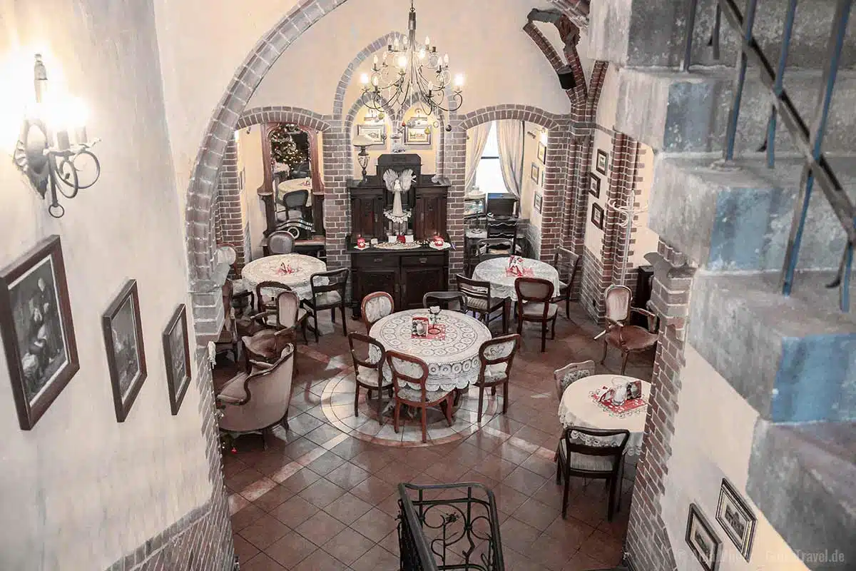 Der Turm beherbergt aber noch einen Geheimtipp. Auf den unteren zwei Etagen befindet sich ein gemütliches Café in ganz besonderer Atmosphäre. Hier solltest du unbedingt den Apfelkuchen mit Baiser-Haube probieren.